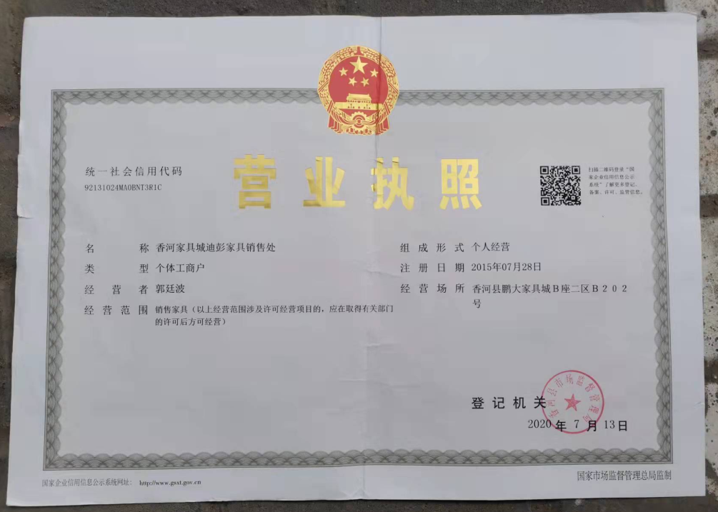 | 统一社会信用代码 | 92131024MA0BNT3R1C | 企业名称 | 香河家具城迪彭家具销售处 | ||